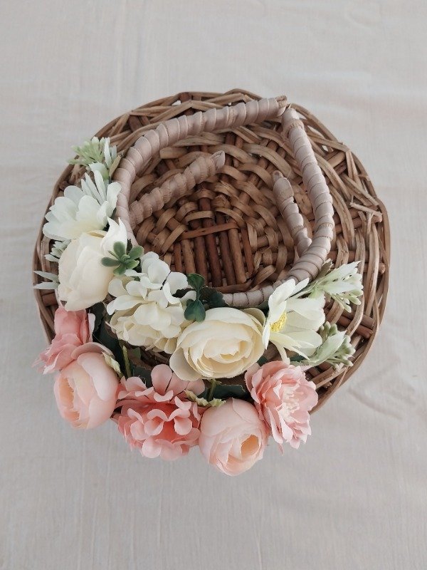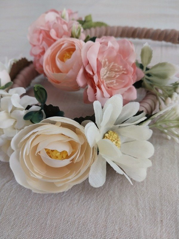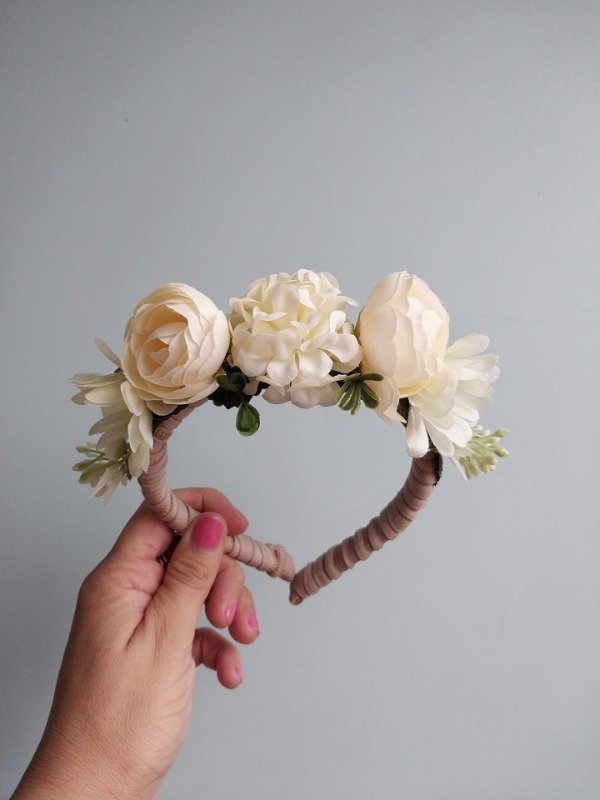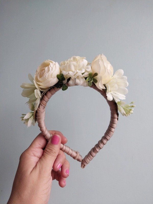 Vincha cuya base es plástica, está totalmente forrada y realizada con flores artificiales.