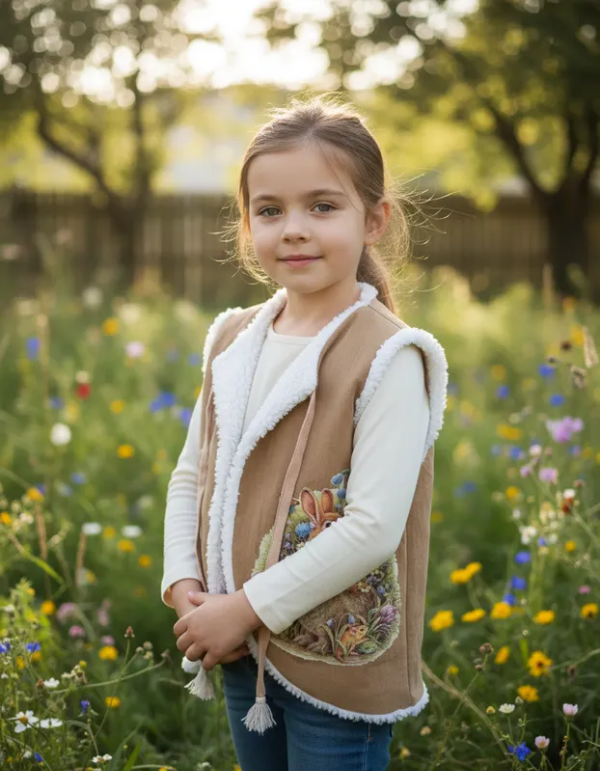 El chaleco Bosques está realizado en tela de algodón plana, está totalmente forrado con tela símil corderito y posee tiras para atar. Estampado en su frente con una ilustracion de un libro antiguo, para que lleves el bosque y las historias, con vos a todos lados 🍄🪵.