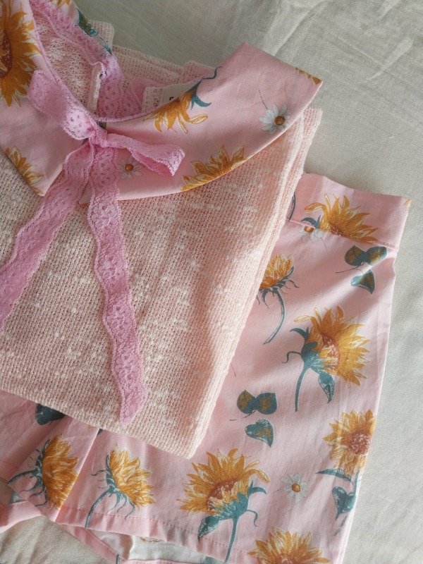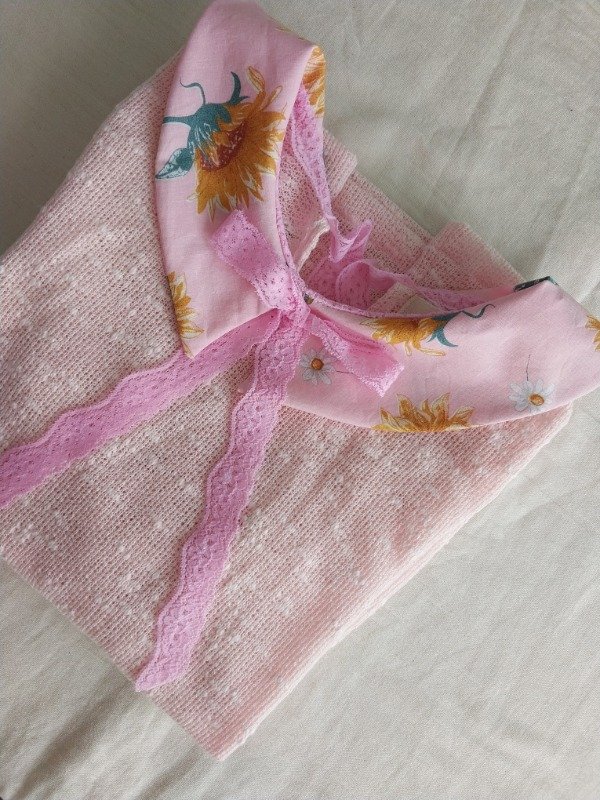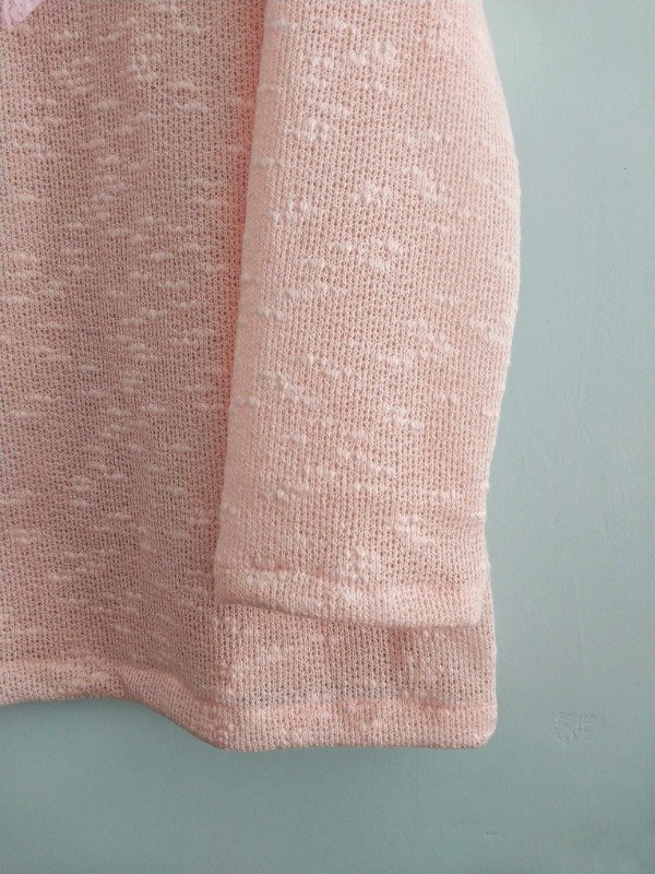 Sweater de hilo boucle con cuello Peter pan. Lazos de puntilla en el frente y espalda, ideal para tardes frescas.