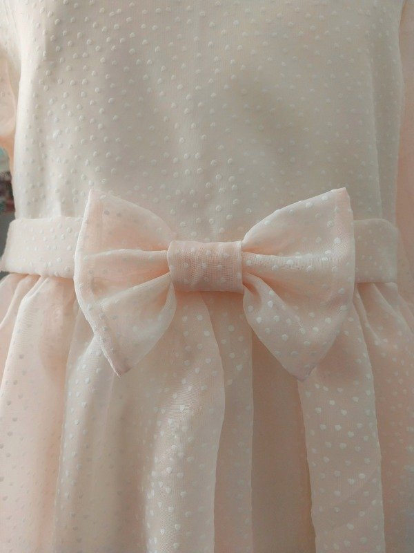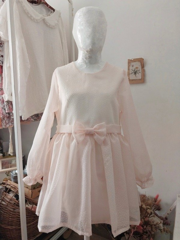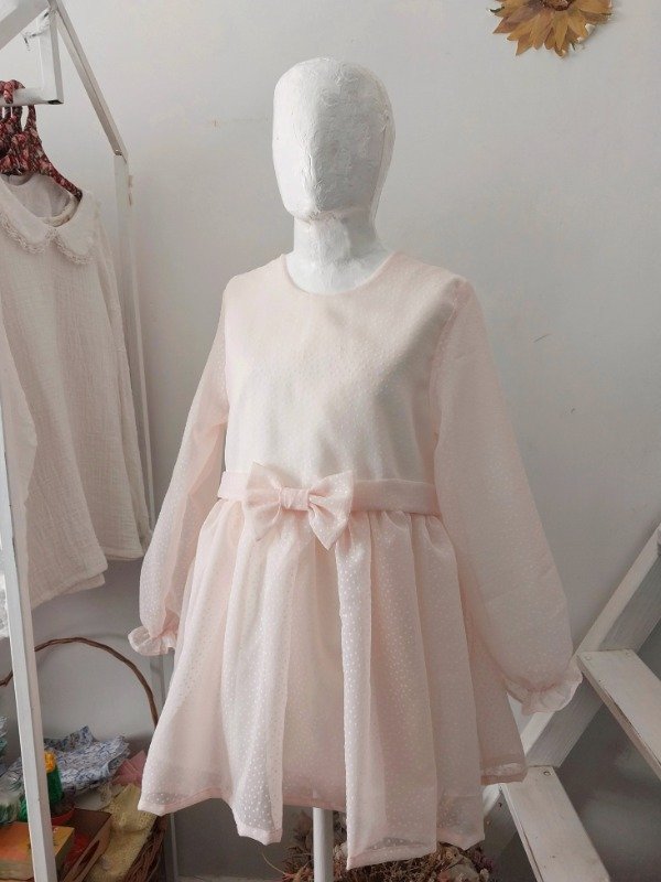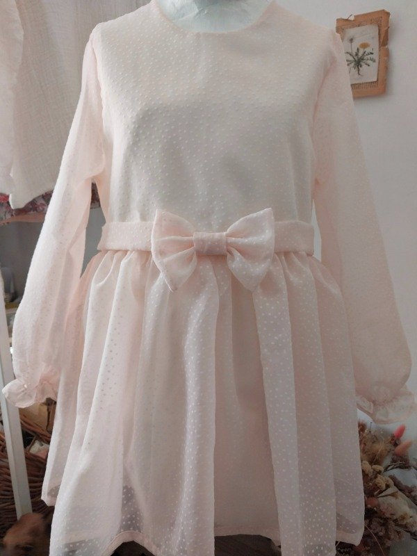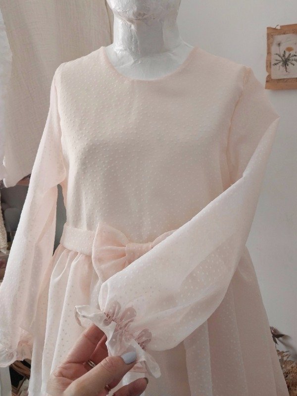 Vestido realizado en gasa de poliester, esta totalmente forrado en su interior y sus mangas tienen transparencia. Posee un hermoso moño acompañado por un cinto que se puede regular como mas te guste.